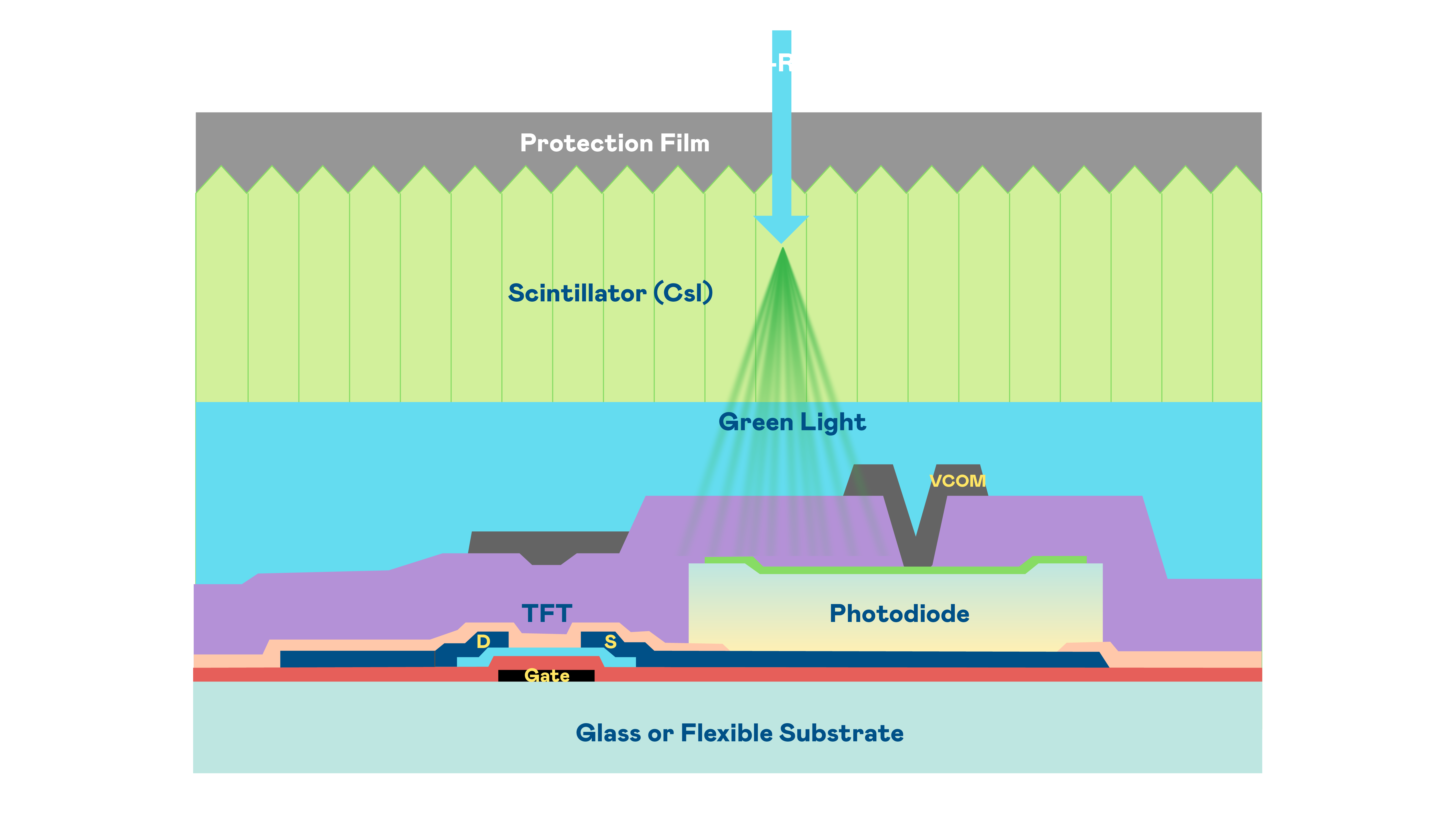 金年会金字招牌信誉至上入口的X光影像感测阵列使用薄膜电晶体 (TFT) 作为每个像素的读取开关,搭配光电二极体(Photodiode)的光电转换元件,用以感测X光影像讯号。